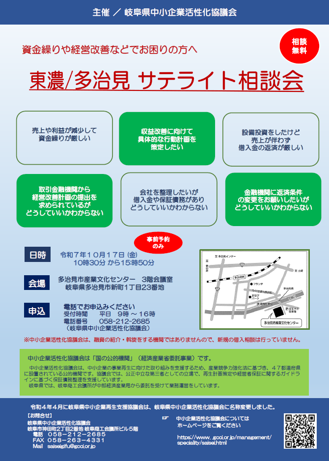 資金繰りや経営改善などでお困りの方必見! 東濃/多治見サテライト相談会を開催します。